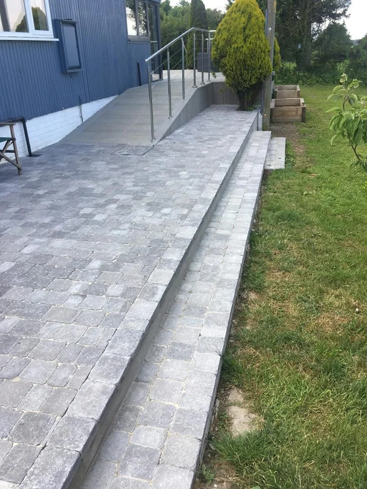 To add a level of shelter from the wind that can whip across the higher land, we have added a very cool-looking glass and wire balustrade. To access the decking area, we built a set of wide, wooden steps. These have very clean lines and add another dimension to the build. A further ramped entry point onto the decking area is suitable for wheeled vehicles.